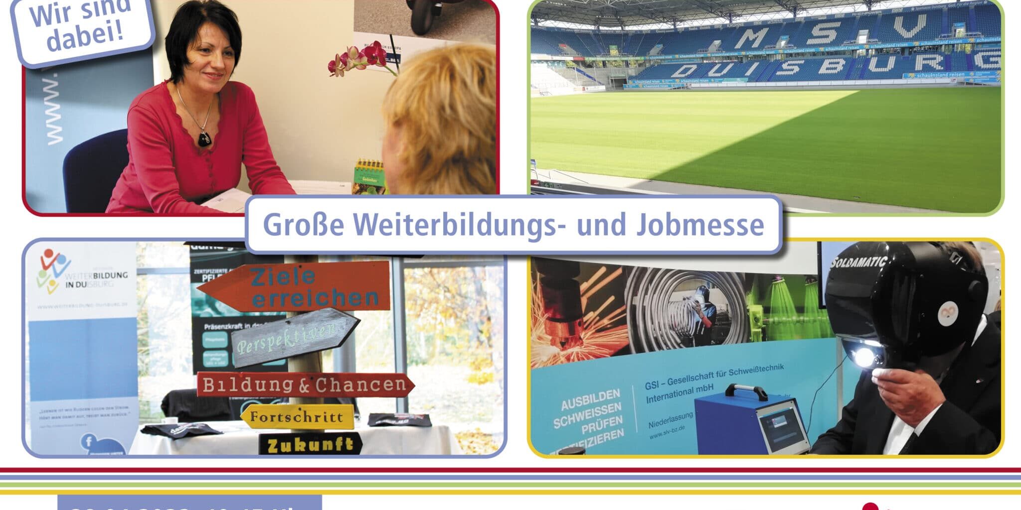 „Arbeit, Bildung, Zukunft“ heißt es wieder bei der größten Job- und Weiterbildungsmesse im Stadtgebiet, die in der schauinsland-reisen-arena stattfindet. Das Netzwerk Weiterbildung Duisburg bringt gemeinsam mit der Agentur für Arbeit Duisburg, dem jobcenter Duisburg und der Stadt Duisburg Publikum und Aussteller erfolgreich zusammen.